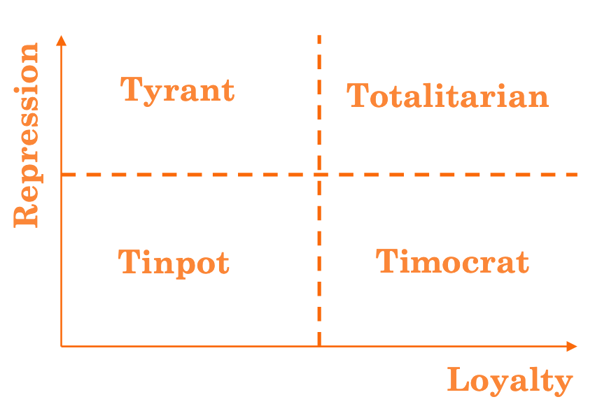 Dictatorships are not all alike. Have a look at the diagram below. A “timocrat”—one who wishes to be loved by the people and uses little or no repression is a “benevolent dictator”. Amusingly, Pope Leo, as head of Vatican City State, falls into this category. Art. 1 of its constitution states that the sovereign power of the Roman pontiff over Vatican City State encompasses all governmental powers, including its legislative, executive, and judicial functions. Yes, read that again: Pope Leo, the dictator.